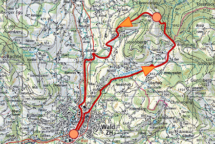 Wald – Sagenraintobel – Wolfsgrueb – Scheidegg – Wald. Distanz ca. 12 km, 600 m ↑, 600 m ↓. Reine Marschzeit ca. 5 Std.