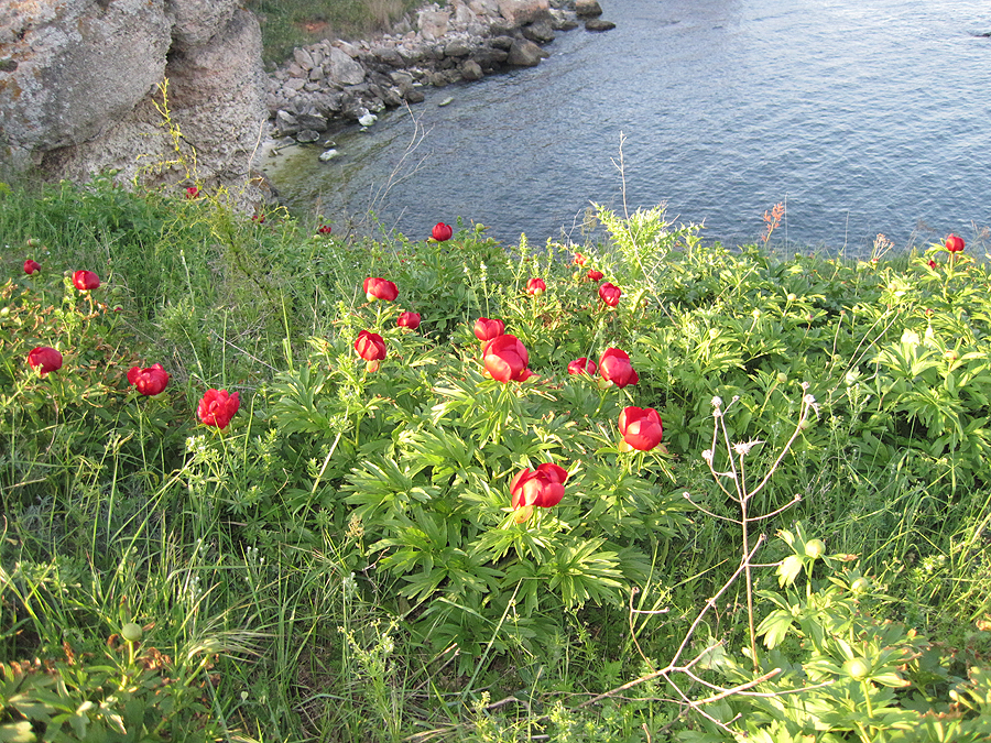 Am schönste Pfingstrosen-Wildstandort, den ich kenne, in Nordostbulgarien am Schwarzen Meer, blühen viele hundert Exemplare von Paeonia peregrina var. romanica. Foto: Walter Good