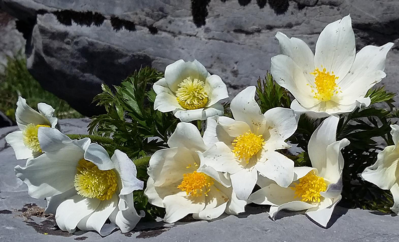 Pulsatilla alpina auf der Spittelmatte (Kandersteg). Gruppe von Blüten, die am gleichen Standort (und aus dem gleichen Rhizom) sowohl hermaphroditische wie männliche Blüten bilden.