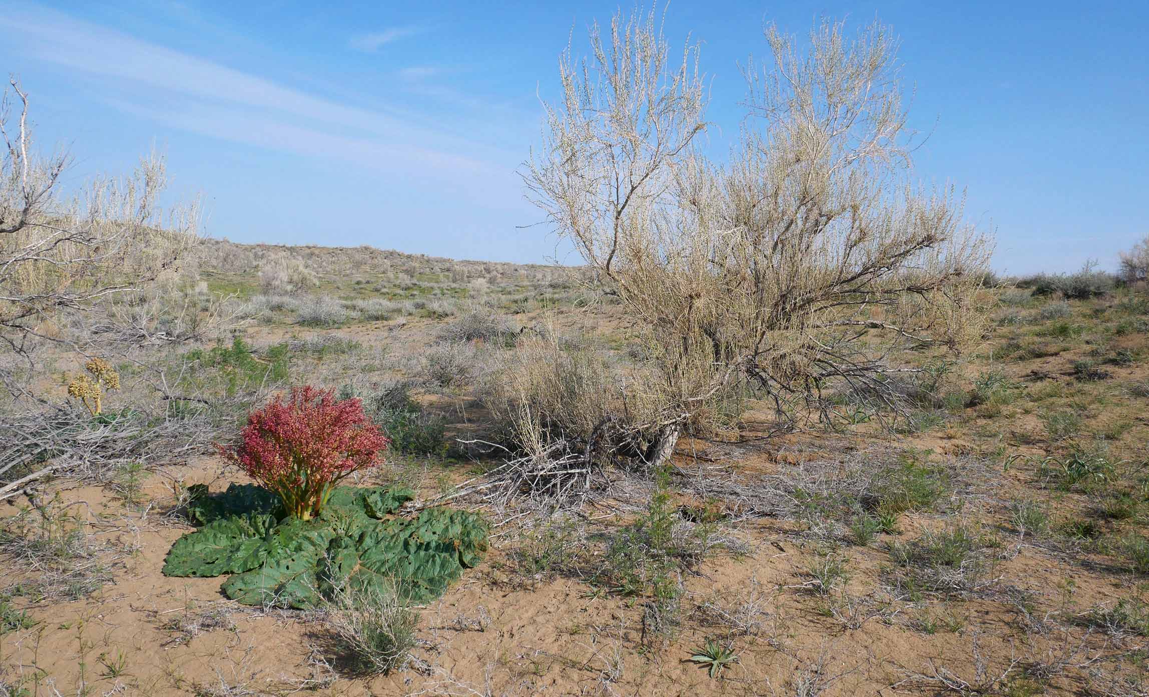 Blühender Wilder Rhabarber (Rheum tataricum) und Weißer Saxaul (Haloxylon persicum) in der Sandwüste südlich des Balchaschsees.
