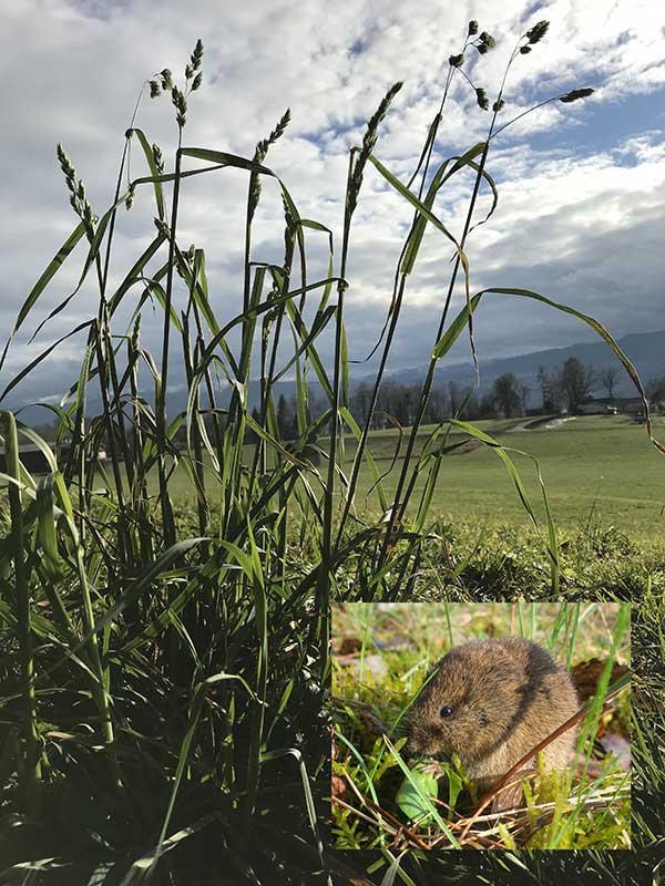 Die Feldmaus fördert durch ihre Ausscheidungen das Knaulgras, welches ihr auch als Nahrung dient: eine wechselseitig positive Beziehung.