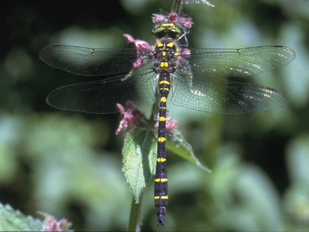 Die Gestreifte Quelljungfer (Cordulegaster bidentata) besiedelt Quellen und Quellbäche hauptsächlich in Höhen von rund 800 m. Foto Daniel Küry